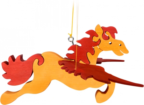 Očarljiva lesena dekoracija za otroško sobo – leteči konj, ki ob potegu za vrvico začne »mahati s krili«. Ročno zglajen les, varna izdelava in preprosto obešanje naredijo to visečo dekoracijo za prikupen dodatek nad posteljico ali v igralnem kotičku.