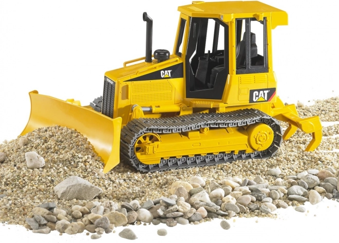Model s podrobnim dizajnom, značilnim za stroje znamke CAT, vključno z gumijastimi gosenicami in veliko premično lopato.