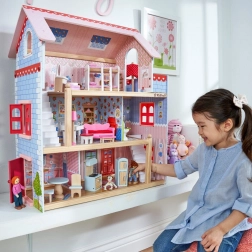 Hišica ponuja 3 nadstropja in 5 sob z balkonom – idealen prostor za ustvarjalno igro in oblikovanje lastnih zgodb.