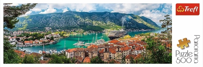 Puzzle prikazuje slikovito sceno pristaniškega mesteca Kotor z njegovimi ikoničnimi rdečimi strehami in zelenimi gorami.