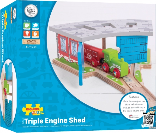 Praktična in zabavna razširitev za vašo leseno železnico: trojna lokomotivna lopa z vrati znamke Bigjigs Rail ponuja varno »parkiranje« lokomotiv in vagonov, zahvaljujoč pametnim kretnicam pa omogoča vožnjo v tri smeri. Izdelana je iz kakovostnega lesa, je združljiva z večino lesenih železniških prog na trgu in izpolnjuje evropske varnostne standarde.