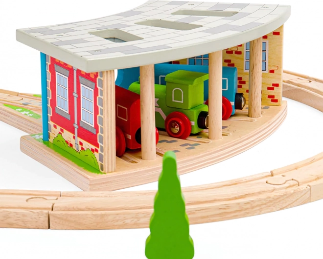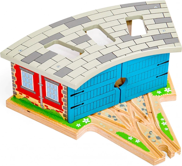 Trojna lokomotivna lopa z vrati je idealen dodatek za vsakega malega strojevodjo. Zahvaljujoč trem stojem in vgrajeni povezavi tirov boste zlahka organizirali promet na progi in pospravili vlakce po dnevu polnem vožnje. Trdna lesena konstrukcija z barvnimi podrobnostmi deluje realistično in prenese tudi intenzivno igro.