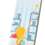 Ljubka račka iz barvano laziranega lesa, ki se pri potiskanju maja na nožicah. Podpira otroke pri učenju hoje in jih spremlja pri njihovih prvih korakih.