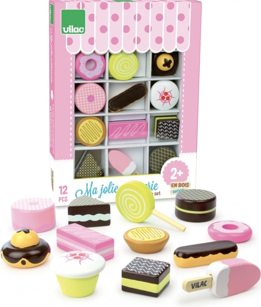 Privoščite malim slaščičarjem in kuharicam veselje ob igri s kompletom lesenih slaščic VILAC. Pisane slaščice in dobrote so videti kot prave, odlično se podajo k otroški kuhinjici in igri trgovine ter prijetno razvijajo domišljijo in fino motoriko.