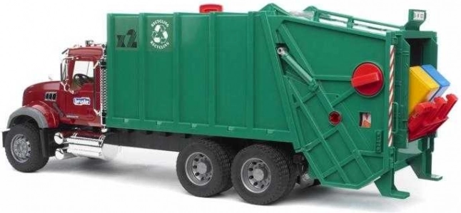 Popolnoma funkcionalna dvižna naprava izprazni smetnjake v zbiralnik, kjer stiskalnica za odpadke material potiska v zadnji del vozila. Po napolnitvi je mogoče zadnji del odpreti in tovor izprazniti. Vse dopolnjujejo odpirajoča se vrata kabine, nagibni pokrov motorja z vpogledom v motor in zložljiva vzvratna ogledala. Model je izdelan v Nemčiji iz kakovostne plastike in prenese tudi intenzivno otroško igro.