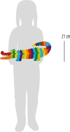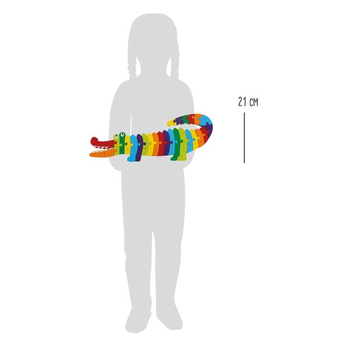 Barvita lesena sestavljanka v obliki krokodila otrokom na igriv način pomaga osvojiti abecedo in barve. Komplet vsebuje 26 kosov s črkami A–Z, ki se sestavijo v celoto. Gladki, zaobljeni robovi in varni materiali s certifikatom CE zagotavljajo udobno in varno igro. Odlično za razvoj fine motorike in koordinacije oko–roka, idealno doma in v vrtcih.