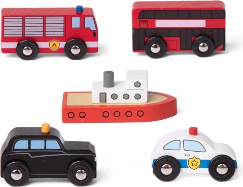 Razširite otroško železniško postavitev s petimi priljubljenimi prevoznimi sredstvi in uživajte v neskončnih urah ustvarjalne igre. Leseni gasilni avto, policijski avto, dvonadstropni avtobus, črni taksi in ladja spodbujajo domišljijo, fino motoriko in koordinacijo. Set je združljiv z večino lesenih vlakcev na trgu in je izdelan iz kakovostnih, odgovorno pridobljenih materialov, ki izpolnjujejo evropske varnostne standarde.