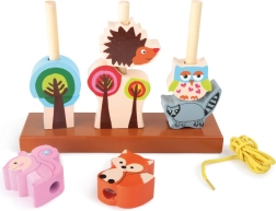 Ta kakovosten leseni komplet združuje zlaganje in nizanje v eno pametno igro. Otroci lahko ježa, lisico, veverico, rakuna in sovo zložijo na stojalo s tremi količki ali jih nizajo na priloženo vrvico. Deli so robustni, dobro ležijo v otroški roki in s svojimi barvami spodbujajo domišljijo.