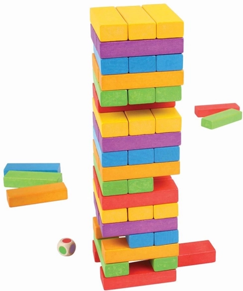 Gradbena in spretnostna igra, ki navduši vso družino. Vrzi barvno kocko, izvleci ustrezni košček in ga položi na vrh – stolp raste, napetost tudi! Zahvaljujoč kakovostni leseni izvedbi in živim barvam je igra trpežna, varna in privlačna na pogled.