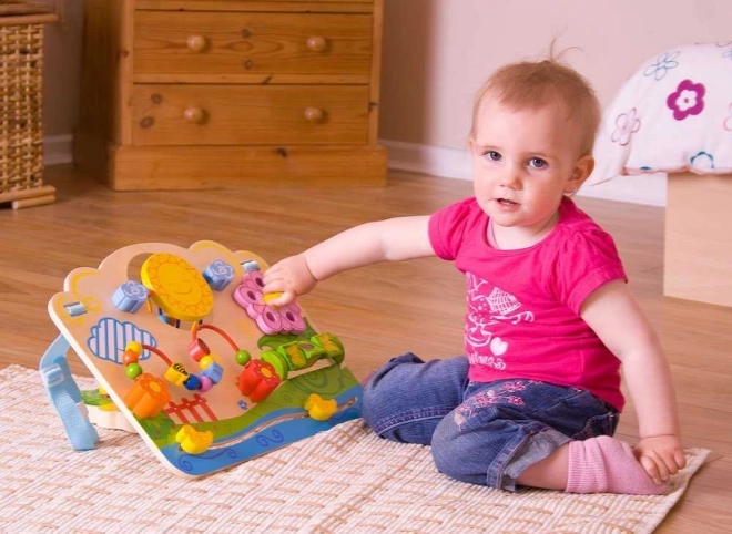 Odkrijte igrivo motorično ploščo za najmlajše, ki razvija fino motoriko, čutno zaznavanje in koordinacijo oko–roka. Barviti elementi, kot so vrteči labirint, pikapolonice, čmrlj in metulj na krogličnem labirintu ter drsne račke, otroke zabavajo in podpirajo njihov razvoj. Ploščo je mogoče z nastavljivimi nosilci pritrditi tudi na posteljico. Izdelana je iz kakovostnih, odgovorno pridobljenih materialov in izpolnjuje evropske varnostne standarde. Primerno od 6 mesecev dalje.