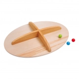 Ravnotežna deska je izdelana iz certificiranega, naravnega lesa in ponuja ekološko in vzdržljivo konstrukcijo. Otroci lahko stojijo na ovalni ploščadi in poskušajo vzdrževati ravnotežje med vodstvom barvne kroglice skozi izrezan labirint. Ta privlačen način igre spodbuja tekmovanje in razvoj ključnih motoričnih veščin.