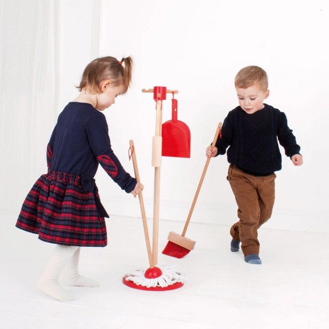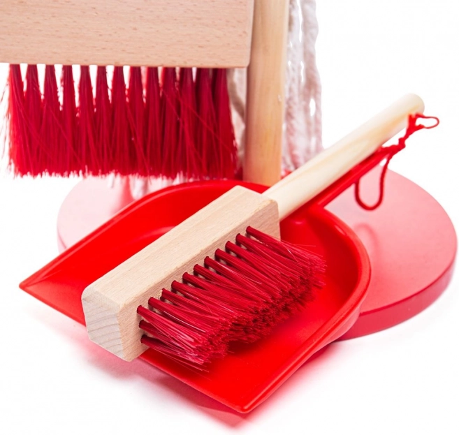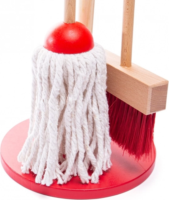 Otroški čistilni set v rdeči barvi spodbuja domiselno igro in otroke naravno vodi k učenju domačih opravil. Zahvaljujoč trdni leseni konstrukciji in premišljeno zasnovanemu stojalu imajo vsi deli svoje mesto, zato je pospravljanje po igri prav tako enostavno kot sama zabava.