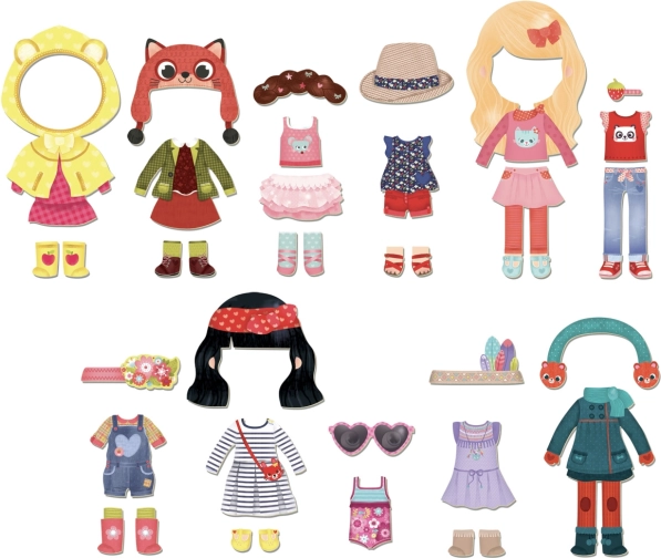 Set vsebuje široko paleto oblek, jaken, čevljev in dodatkov, s katerimi si otroci zlahka ustvarijo lastne modne zgodbe.