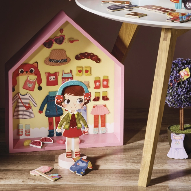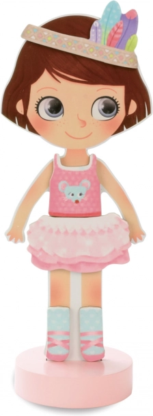 Magnetna punčka za oblačenje Chloe je idealna igrača za otroke, ki imajo radi modo in stil. Stabilen leseni podstavek zagotavlja udobno oblačenje in predstavitev oprav. Z bogatim kompletom magnetnih kosov je mogoče kombinirati nešteto videzov – od oblek in jaken do kap in čevljev.