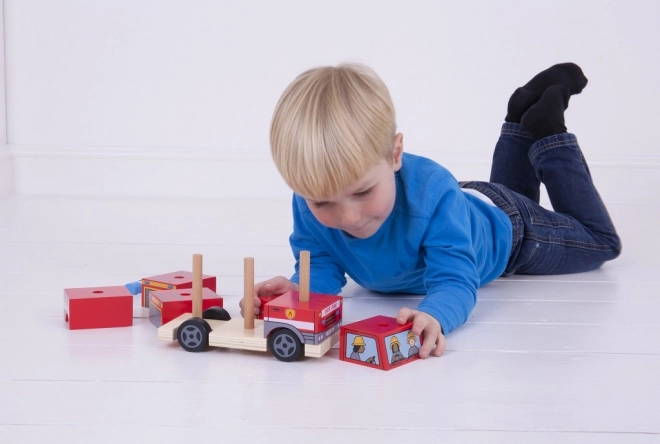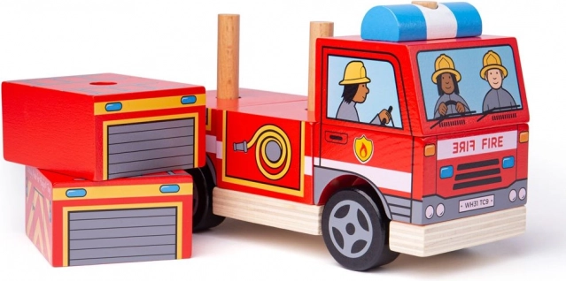 Ta pametna igrača združuje zabavo in učenje: otroci nizajo posamezne dele na lesene palice, urijo koordinacijske spretnosti, prepoznavanje oblik in barv, nato pa se s končnim gasilskim avtom podajo v akcijsko zgodbo. Robustni les, gladki robovi in izrazite barve zagotavljajo varno in privlačno igro.