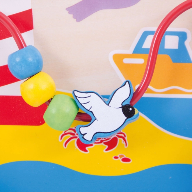 Ta lesena aktivnostna plošča z navtičnim motivom prinaša otrokom pisano paleto dejavnosti: vrtljivi labirint, rotirajoče se morske konjičke, drseče ribice in žičko z biserčki ter galebi. Vsak element je zasnovan tako, da podpira naravni razvoj spretnosti, potrpežljivosti in zbranosti. Z nastavljivimi nosilci lahko ploščo varno pritrdite tudi na posteljico ter dojenčku zagotovite spodbudno zabavo na dosegu.