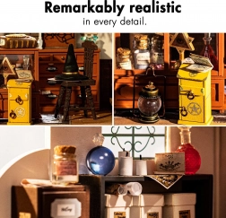 Lesene police, predalniki in pult z napoji, kristali ter čarovniškim klobukom prinašajo realističen videz in veselje ob odkrivanju vsakega kotička.