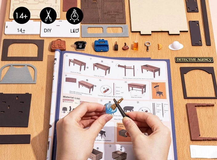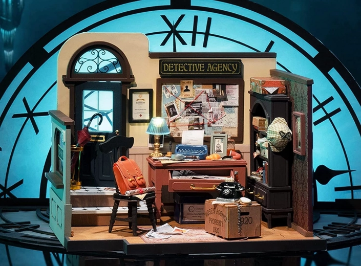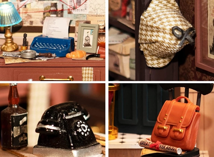 Odkrijte čar klasične detektivke z nostalgičnimi elementi – od retro pisalnega stroja preko rotacijskega telefona do oglasne deske z namigi in ikoničnega detektivskega klobuka. Vsak kos sestavite z lastnimi rokami, končni model pa z LED osvetlitvijo ustvari prepričljivo atmosfero tudi po mraku.