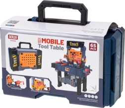 Ta prenosni kovček se zlahka razgradi v otroško delovno mizo z veliko odlagalnega prostora – od spodnje škatle za večje dele, prek perforirane stene za orodje, do dveh poličk in prostorne delovne plošče. Otroci se naučijo osnov ročnih spretnosti in varno preizkusijo dejavnosti, kot so »vijakanje«, »zabijanje« ali »rezanje«.