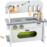 Kompaktna otroška kuhinjica iz FSC certificiranega lesa prinaša vse za realistično igro kuhanja: pečico z magnetnimi vratci, vrtljive gumbe s klikanjem in bogato opremo, vključno z loncem s pokrovko, solnico in popernico. Zaradi pametne konstrukcije jo lahko sestavite in razstavite brez uporabe orodja.