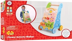 Robustna lesena konstrukcija, zanesljiv ročaj in barvita kolesa podpirajo varen in samozavesten korak malčkov.