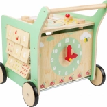 Lesena konstrukcija in večfunkcijski dizajn spodbujata razvoj ustvarjalnosti in motorike zaradi vgrajenega zavornega sistema, risalne table in učnih ur.