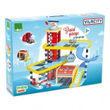 Odkrijte zabavo z leseno garažo VILAC Vilacity! Ta velika večnadstropna garaža ponuja delujoče dvigalo, zložljiva vrata, parkirno zapornico, bencinski avtomat in ščetke za pranje. Priložena so 2 avtomobilčka in helikopter, popolna združljivost s kolekcijo VILACITY ter okolju prijazna izdelava.
