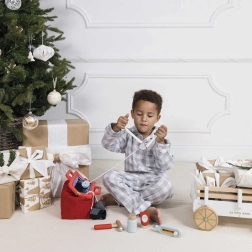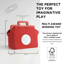 Ta dizajnerska zdravniška torba iz kolekcije Honeybake znamke LE TOY VAN je odlično izhodišče za igro vlog. Vintage tekstilna torba s trdim dnom in lesenimi ročaji skriva 10 skrbno izdelanih dodatkov, ki otrokom omogočajo posnemanje pravega zdravniškega pregleda. Del kompleta so tudi natisljive kartice z »zdravniškim receptom« za še bolj realističen doživljaj.