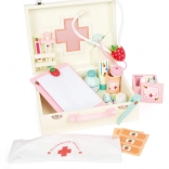 Z realističnimi dodatki, kot so stetoskop, termometer, injekcijska brizga, mazila in zdravila, otroci razvijajo socialne veščine, empatijo in komunikacijo. Trpežni materiali (les, tekstil in papir) zagotavljajo varno in dolgotrajno zabavo.