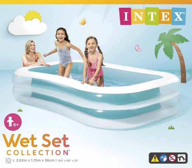 Družinski napihljiv bazen INTEX Swim Center je odlična izbira za vrt ali teraso. Zahvaljujoč dvema ločenima zračnima komorama je stabilen, udoben in hitro pripravljen za vodne užitke. Trpežna konstrukcija iz materiala debeline 0,30 mm in barvna izvedba zagotavljata dolgo življenjsko dobo in privlačen videz.