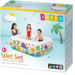 Napihljiv bazen, navdihnjen s podvodnim svetom, je idealen dodatek za poletne dni. Izdelan je iz visokokakovostnega vinila debeline 0,28 mm, kar zagotavlja njegovo trpežnost in dolgo življenjsko dobo. Zahvaljujoč priloženemu kompletu za popravilo je pripravljen na nepričakovane situacije.