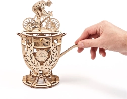 Mehanski model UGEARS Kolesar združuje tradicionalen les in pametno mehaniko. Gradbeni komplet v obliki trofeje s kolesarjem ponuja gladko delovanje zobnikov, ročno upravljanje z ročico in možnost natančnega uravnavanja vztrajnika s kovanci ali žetoni. Odlična izbira za ljubitelje konstrukcijskih izzivov, oblikovanja in tehnike.