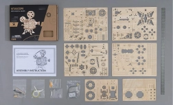 Komplet vsebuje vse potrebno: predrezane dele iz vezane plošče, jeklene osi, diodo, filmski trak ter ilustriran priročnik z QR kodo do montažnega videa. Model je odlično darilo in hkrati dizajnerska dekoracija za delovno sobo ali dnevni prostor.