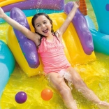 Veselo vodno igrišče Intex Dinoland spremeni vrt v prostor poln poletne zabave. Otroci se spustijo po napihljivem toboganu v plitvino, se osvežijo pod vodno fontano in se igrajo z napihljivim dinozavrom s košem za metanje. Mehka pristajalna podloga povečuje udobje in varnost pri razposajeni igri.