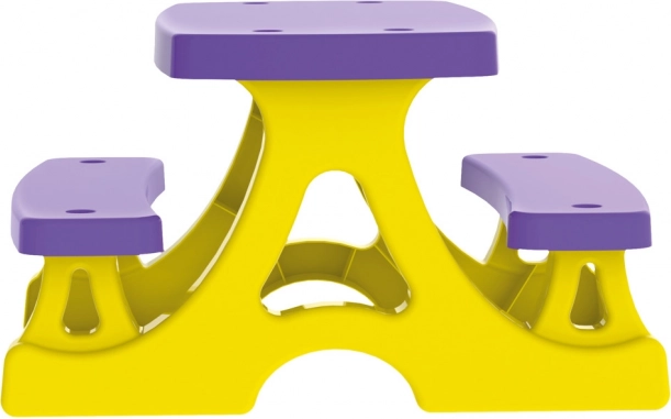 Komplet v živahni rumeno‑vijolični kombinaciji poživlja vsak prostor ter nudi stabilno mesto za prigrizke, ustvarjalne dejavnosti in skupne trenutke.