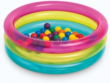 Vesel nafukljiv suhi bazen z žogicami znamke INTEX spremeni vsako otroško sobo ali vrt v varno igrišče. Prosojne stene s rožnatim, rumenim in modrim pasom. Odporno PVC zagotavlja enostavno vzdrževanje in dolgo življenjsko dobo, idealno za otroke 1–3 leta.