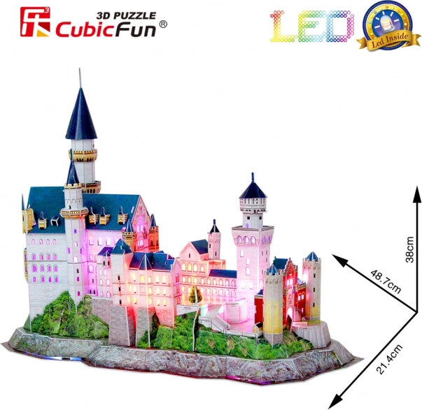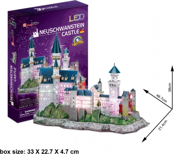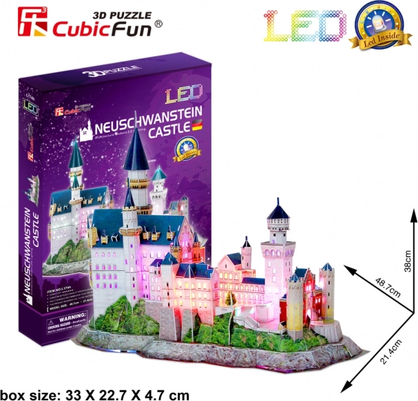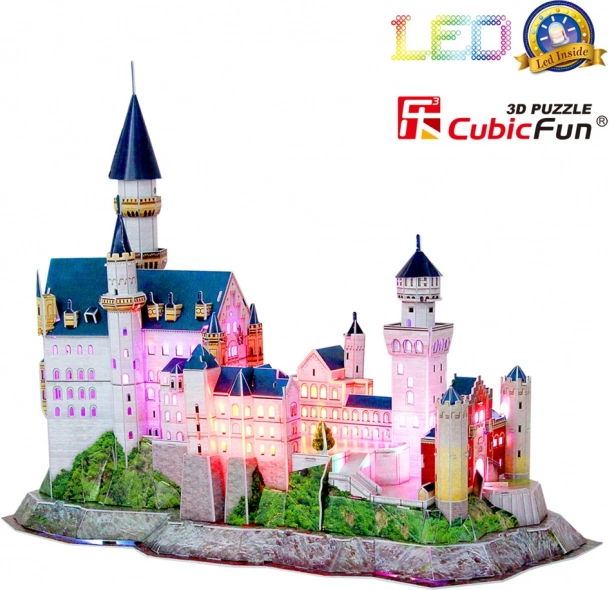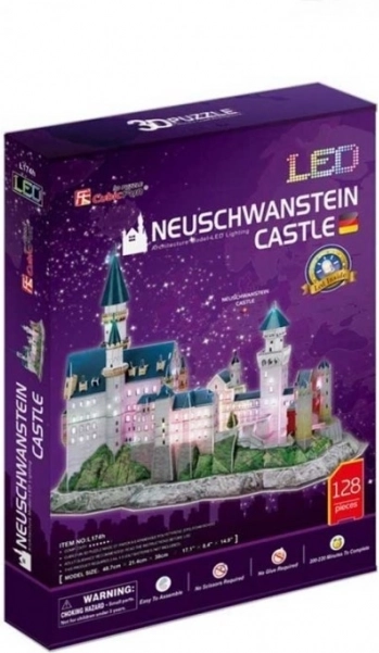 Odkrijte čar romantčne arhitekture z natančnim 3D modelom gradu Neuschwanstein. Zahvaljujoč LED osvetlitvi model izstopa podnevi in ponoči ter postane okras vsake sobe. Komplet je zasnovan za udobno sestavljanje brez uporabe lepila in škarij – predrezane dele je treba le izlomiti in slediti navodilom.