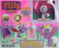 Komplet Filly Stars vabi otroke v svet poln domišljije. Konjiček s čarobnim rogom, bleščečimi krili in kronico s kristalom navdihuje zgodbe o prijateljstvu, praznovanjih in čajankah. Zahvaljujoč pestri paleti dodatkov si otroci zlahka ustvarijo lastne prizorčke ter razvijajo domišljijo in fino motoriko.