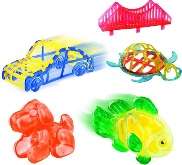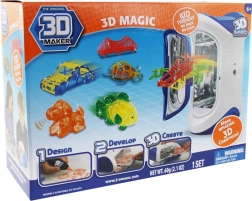 Začetni komplet 3D Magic prinaša preprost in varen način, kako doma ustvarjati lastne 3D objekte – od živalic in avtomobilčkov do mini gradbenih delčkov. Dovolj je, da kalup napolnite s 3D gelom, ga vstavite v 3D Maker in opazujete, kako UV svetloba spremeni vašo idejo v trden model.