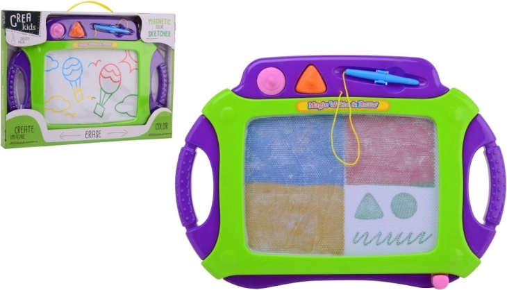 Velika barvna risalna tabla s peresom. Mere 46 × 4 × 33 cm, stranska držala za enostaven oprijem. Idealna za ustvarjalno zabavo doma in na poti.