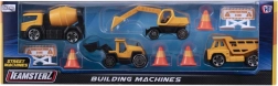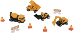 Kombinacija rumenih in črnih plastičnih gradbenih vozil, kot so prekucnik, mešalec, bager in nakladalec, omogoča otrokom simulacijo pravega gradbenega okolja.