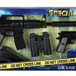 Popoln policijski komplet za male varuhe reda: kovinska pištola s dušilcem, mitraljez, daljnogled, značka in etui. Kovinska izdelava, kapice – 8 strelov in realistična igra. Izdelano v Španiji.