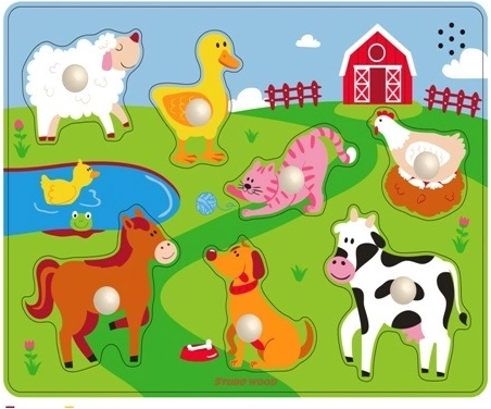 Vstavljanka pomaga širiti besedišče – otroci se med igro učijo poimenovati živali (kravica, ovčka, konjiček, kokoška ipd.) ter zaznavati barve in oblike. Kakovostna lesena izvedba znamke STUDO WOOD je trpežna in varna za majhne otroške ročice.
