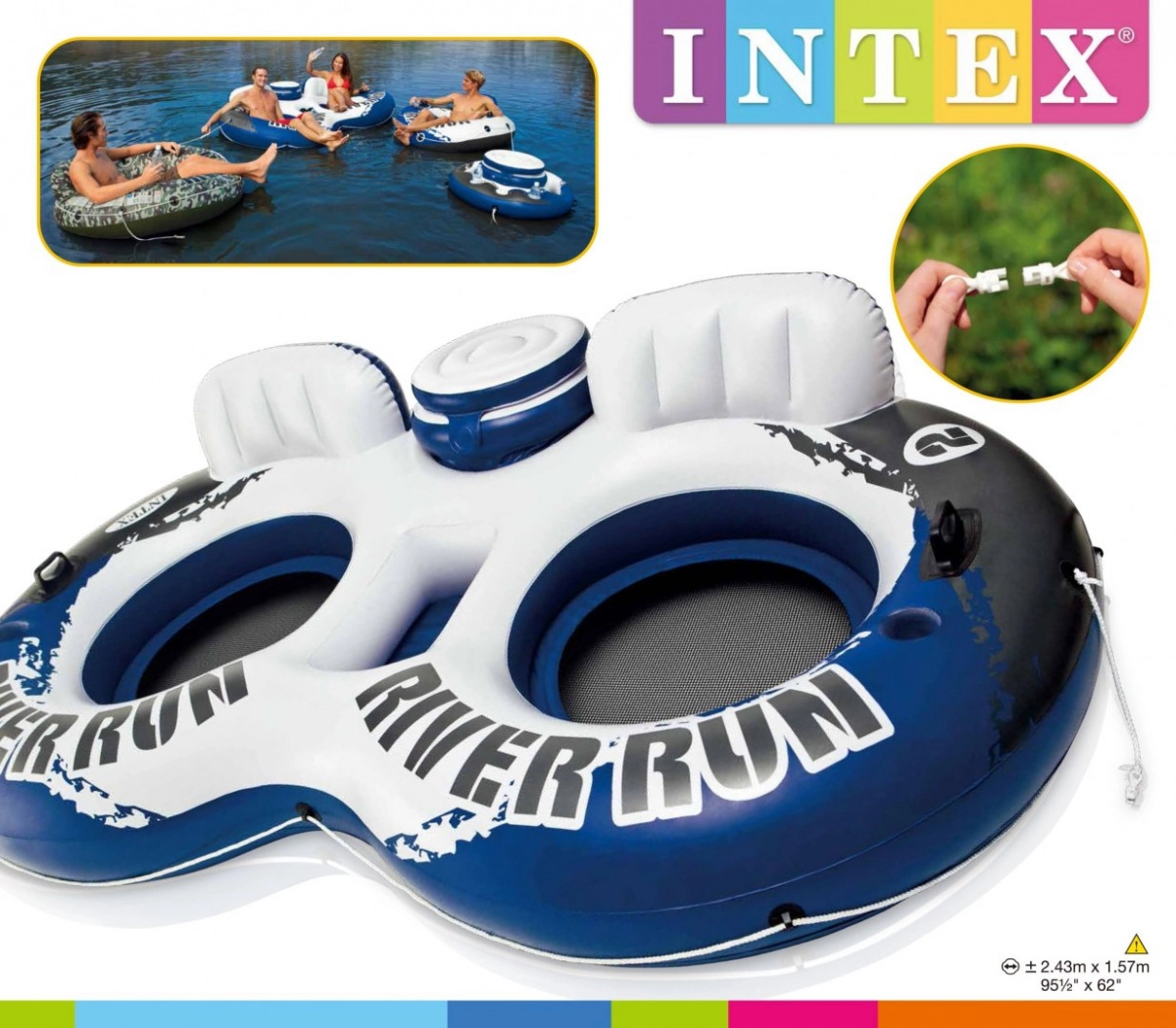 Uživajte v poletju na polno z napihljivim otokom INTEX RIVER RUN 2 za dve osebi. Ponuja mrežasto dno za prijetno hlajenje, integrirana naslonjala za udobno sedenje, vgrajen hladilni predal za pijače in držala za kozarce. Zahvaljujoč obodnemu vrvnemu ročaju, močnejšim ročajem in spojni zaponki ga zlahka pritrdite na drugo plovilo ali pomol. Robustni vinil in 5 zračnih komor zagotavljata stabilnost in varnost na vodi.