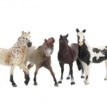 Štiri plastične figurice konjev, vsaka v drugačni barvi, kar otrokom omogoča ustvarjanje različnih prizorov in zgodb.