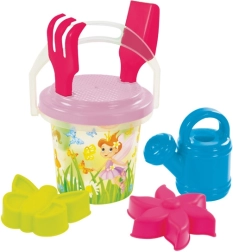 Vse na enem mestu: kanglica s prostornino 1,3 l, grabljice, lopatka, sito, zalivalka in dva modelčka za preprosto oblikovanje in gradnjo gradov.