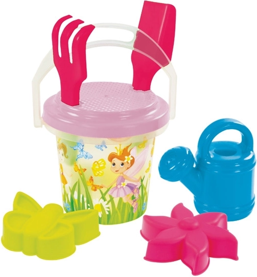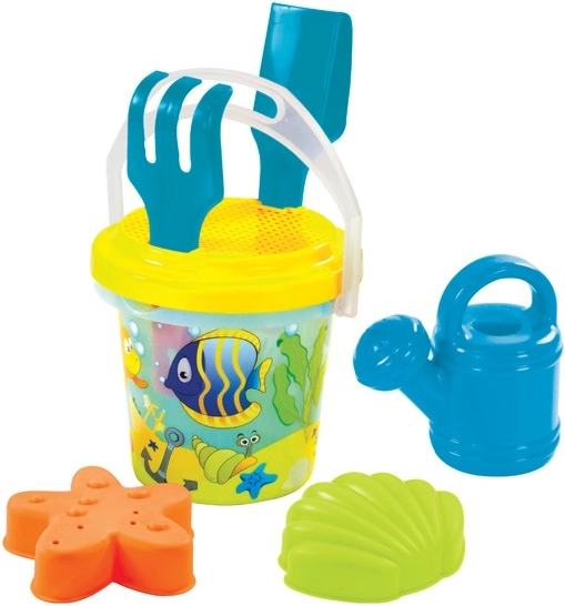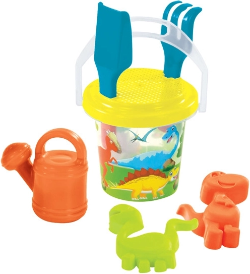Vesel prozoren komplet za pesek za otroke v treh motivih – vile, dinozavri in ribice – prinaša veliko zabave na peskovniku in na plaži. Vsebuje kanglico 1,3 l, grabljice, lopatko, sito, zalivalko in dva modelčka. Izdelano v EU iz kakovostne plastike.