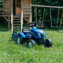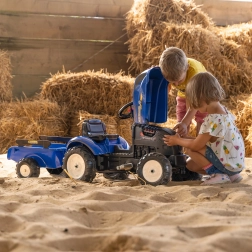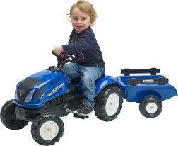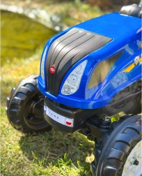 Poganjalni traktor, navdihnjen s pravimi stroji NEW HOLLAND, otrokom prinaša realističen vozniški doživetje. Zahvaljujoč odpirljivemu pokrovu motorja z imitacijo motorja lahko mali vozniki raziščejo “notranjost” stroja, medtem ko verižni pogon na zadnjo os zagotavlja gladko vožnjo. Odstranljiva prikolica je idealna za prevažanje igrač ali drobnih tovorov na vrtu.