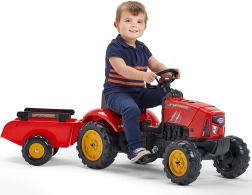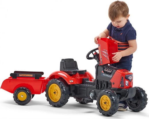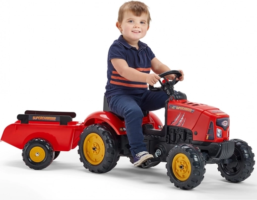 Robusten otroški traktor na pedala je izdelan iz kakovostne in vzdržljive plastike ter zasnovan za vsakodnevno igro. Zahvaljujoč verižnemu pogonu na zadnjo os in vrtljivi sprednji osi je enostaven za upravljanje ter spodbuja razvoj motorike in ravnotežja. Odpirajoč se pokrov z imitacijo motorja dodaja realistične podrobnosti, ki jih otroci obožujejo.