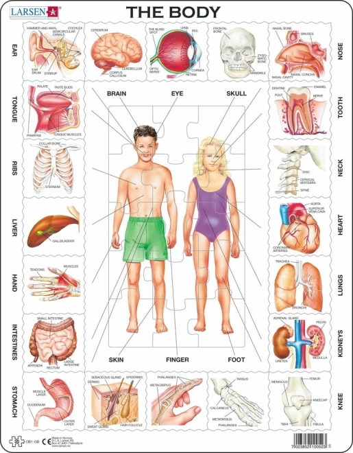 Odkrijte človeško telo na igriv način s sestavljanko znamke Larsen! Po sestavljanju nastane pregleden prikaz glavnih organskih sistemov in delov telesa. 35 trdnih kosov, edinstvene oblike in kakovosten karton zagotavljajo dolgo življenjsko dobo. Sestavljanka razvija logično razmišljanje, prostorsko predstavljivost in potrpežljivost – idealna za otroke od 4 let doma, v vrtcu in v šoli.